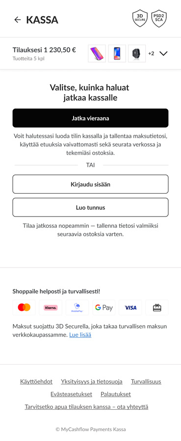 Verkkokauppaan sisäänrakennettu maksupalvelu mahdollistaa keskeytyksettömän ostopolun (on-site checkout), minkä ansiosta asiakas voi viimeistellä maksun poistumatta verkkokaupastasi. Kun ostoprosessi on yhtenäinen ja brändisi mukainen, asiakkaan luottamus säilyy korkeana ja hylättyjen ostoskorien määrä vähenee. Lisäksi laaja valikoima suosittuja maksutapoja varmistaa, että jokaiselle asiakkaalle löytyy mieluinen tapa maksaa ostoksensa.