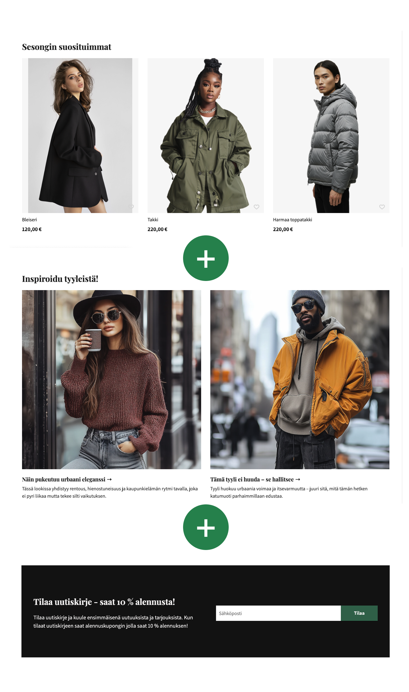 Tuo valitsemasi sisällöt etusivulle muutamalla klikkauksella – valmiit osiot sopivat saumattomasti yhteen, jotta kauppasi pysyy aina selkeänä, yhtenäisenä ja visuaalisesti houkuttelevana. Vie valmis ulkoasu helposti eri kauppaversioihin – säästä aikaa ja varmista yhtenäinen ilme kaikkialla.